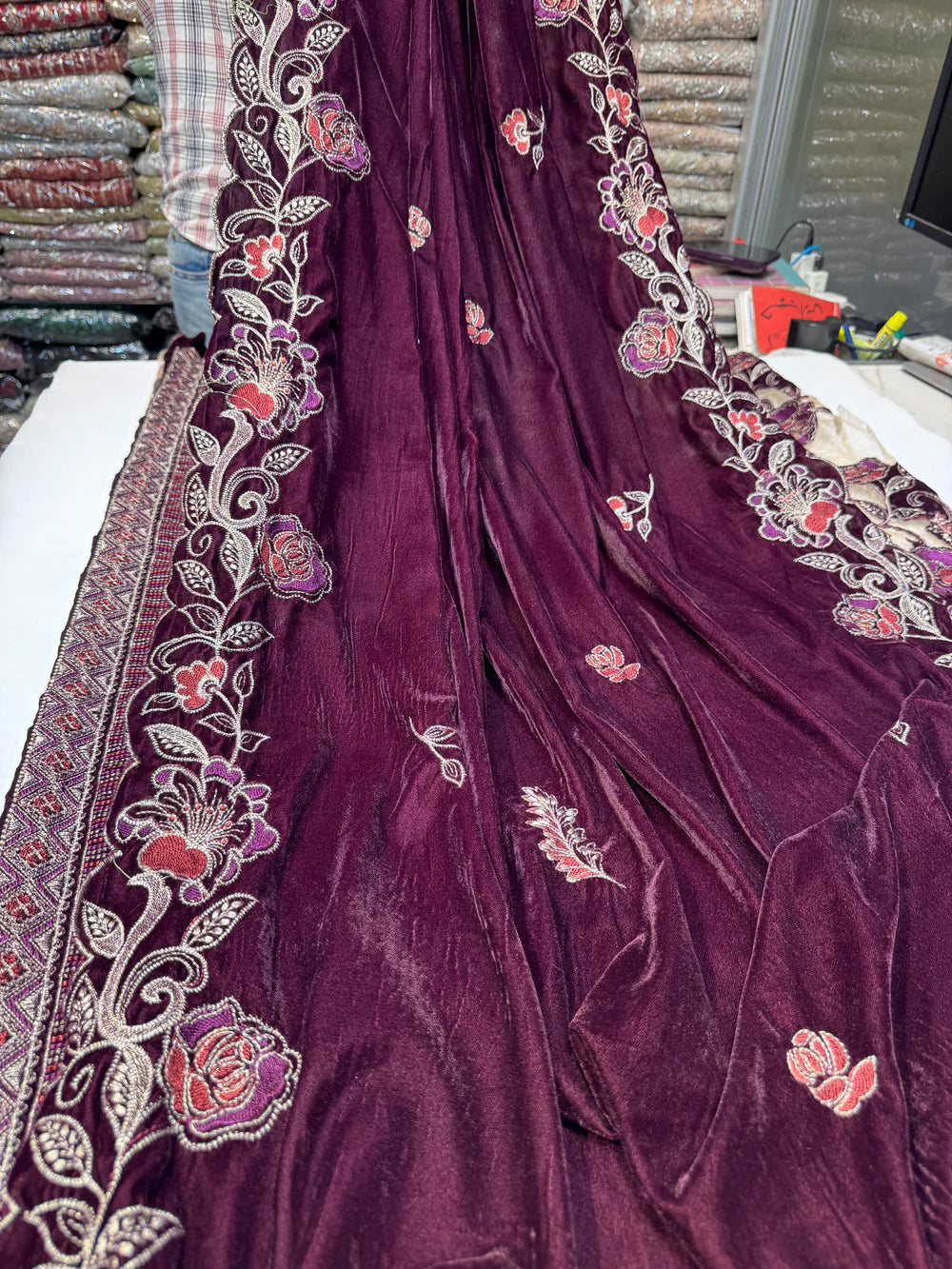 A ready-to-wear embroidered velvet dupatta that enhances the outfit with its plush texture and graceful drape.