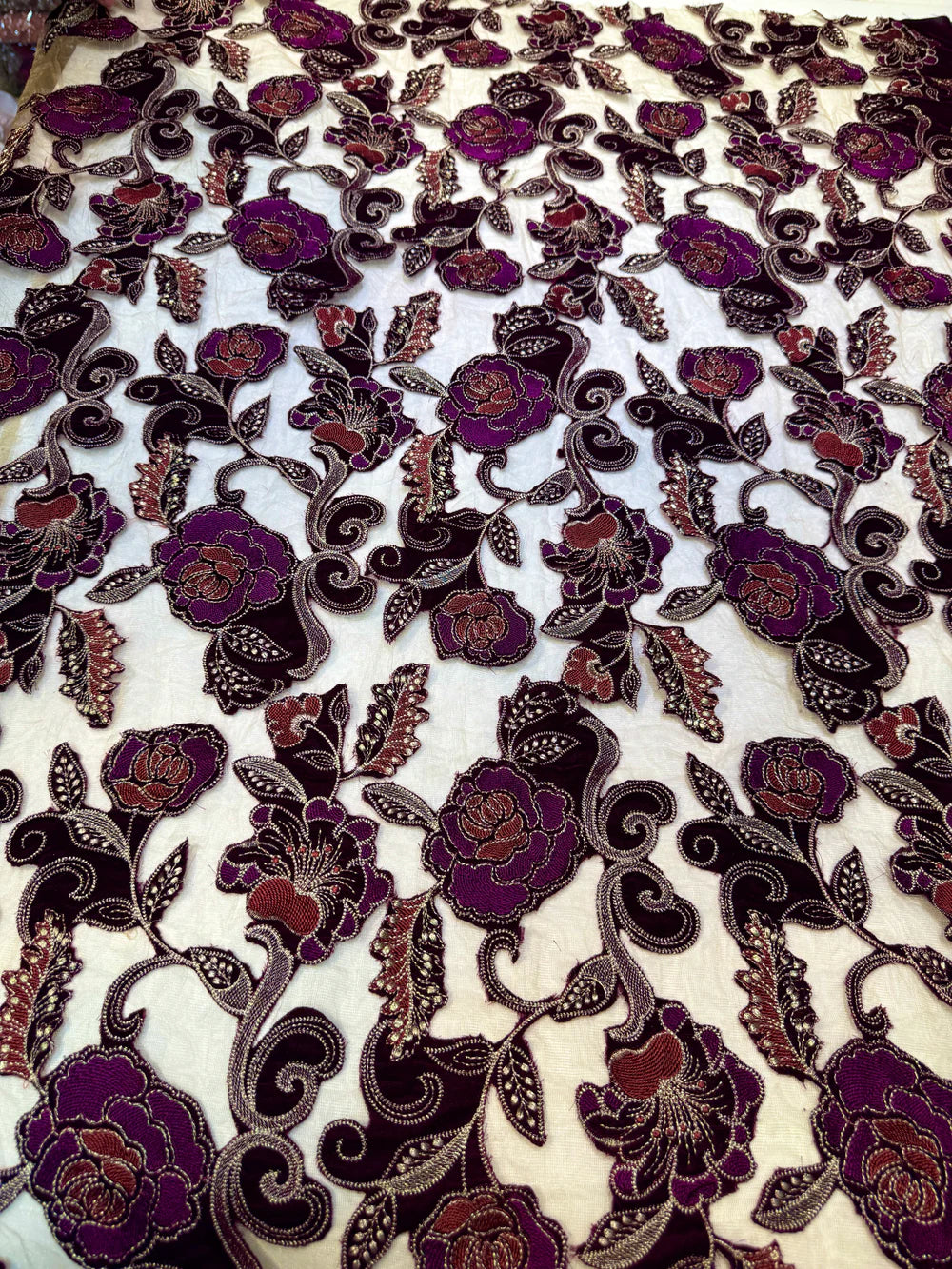 Crafted from rich velvet, this elegant shirt features intricate embroidery and modern laser-cut detailing on the front, paired with embroidered back and sleeves. The deep purple tone adds a royal sophistication, making it perfect for festive and evening occasions.