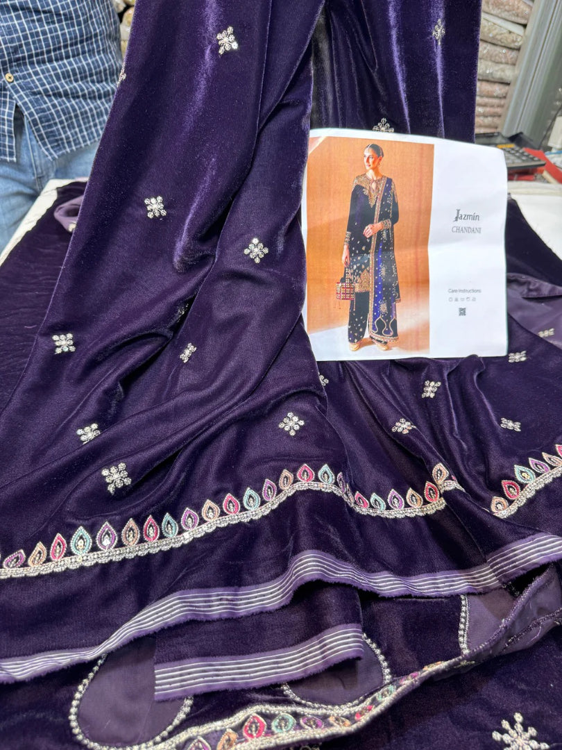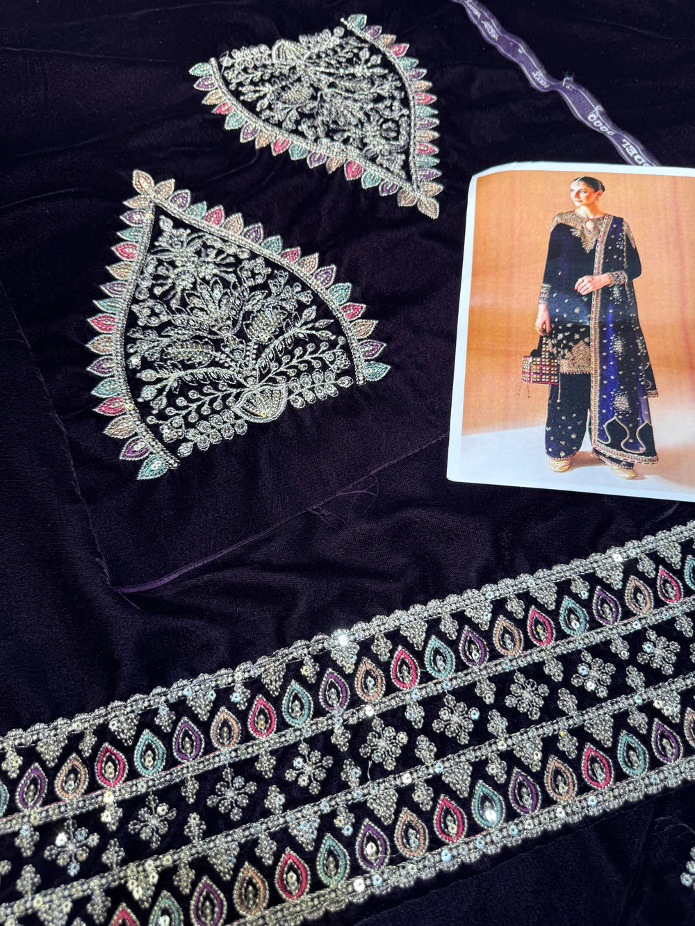 This premium velvet shirt is exquisitely embroidered on the front, back, and sleeves, enhanced with a finely detailed yoke design. The rich texture and intricate craftsmanship create a regal, graceful silhouette perfect for festive and formal occasions.