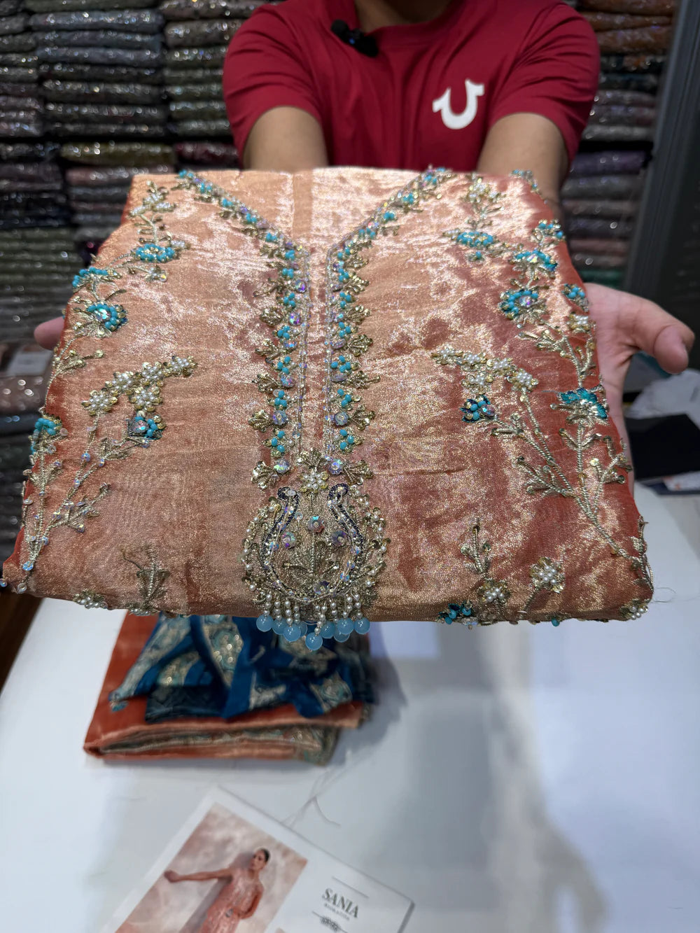 Elegant shisha silk shirt featuring a handcrafted neckline adorned with pearls and fine embellishments. The front, sleeves, and back are richly embroidered and delicately hand-embellished, showcasing signature Saniya Maskatiya craftsmanship.