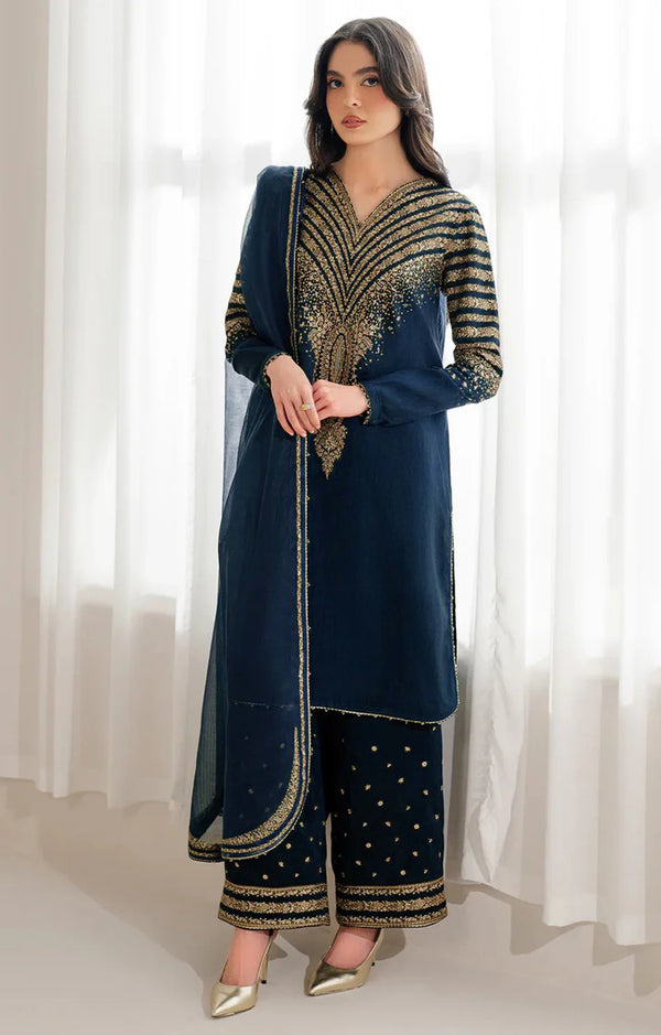 Delicate embroidered chiffon dupatta — ready to wear and perfectly complementing the silk ensemble.