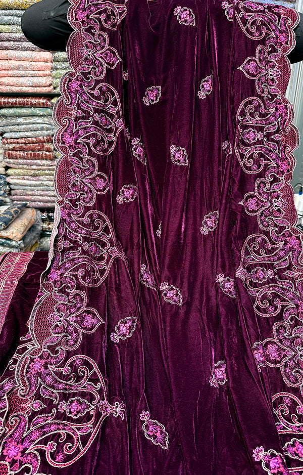 A luxurious Laila Mishra Velvet 3-piece suit in a royal deep purple shade — perfect for winter festivities and evening occasions.