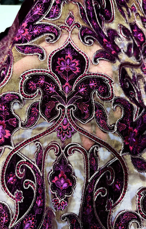 Shirt: Embroidered velvet with laser-cut front design, embroidered back, and sleeves.