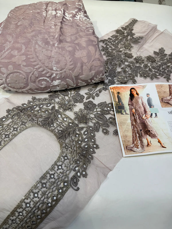 Luxuriously crafted palachi velvet shirt featuring an embroidered organza neckline adorned with 3D flowers and stick-on studs. Detailed with cutwork ghera patch and embroidered sleeve pattis for an elegant festive look.