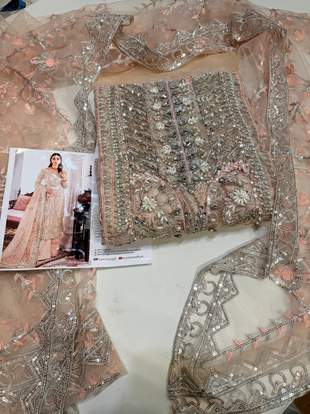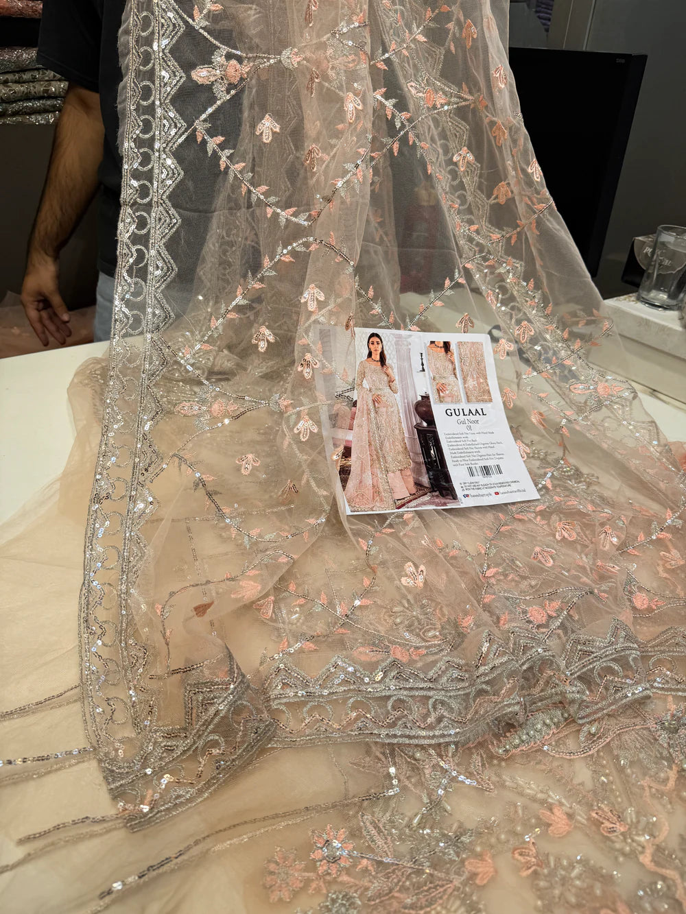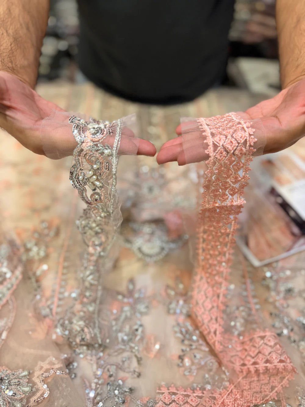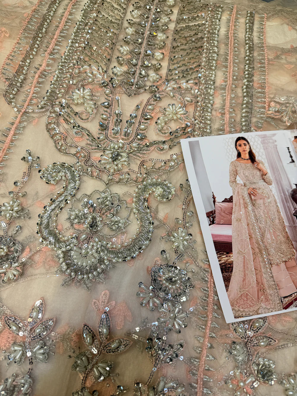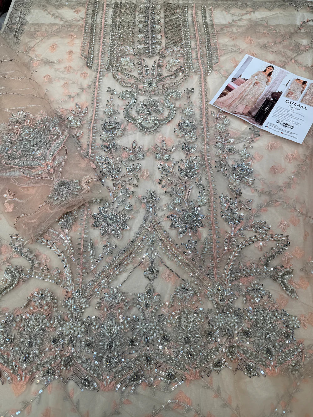 Panelled organza front with embroidery, sequins, and hand embellishments