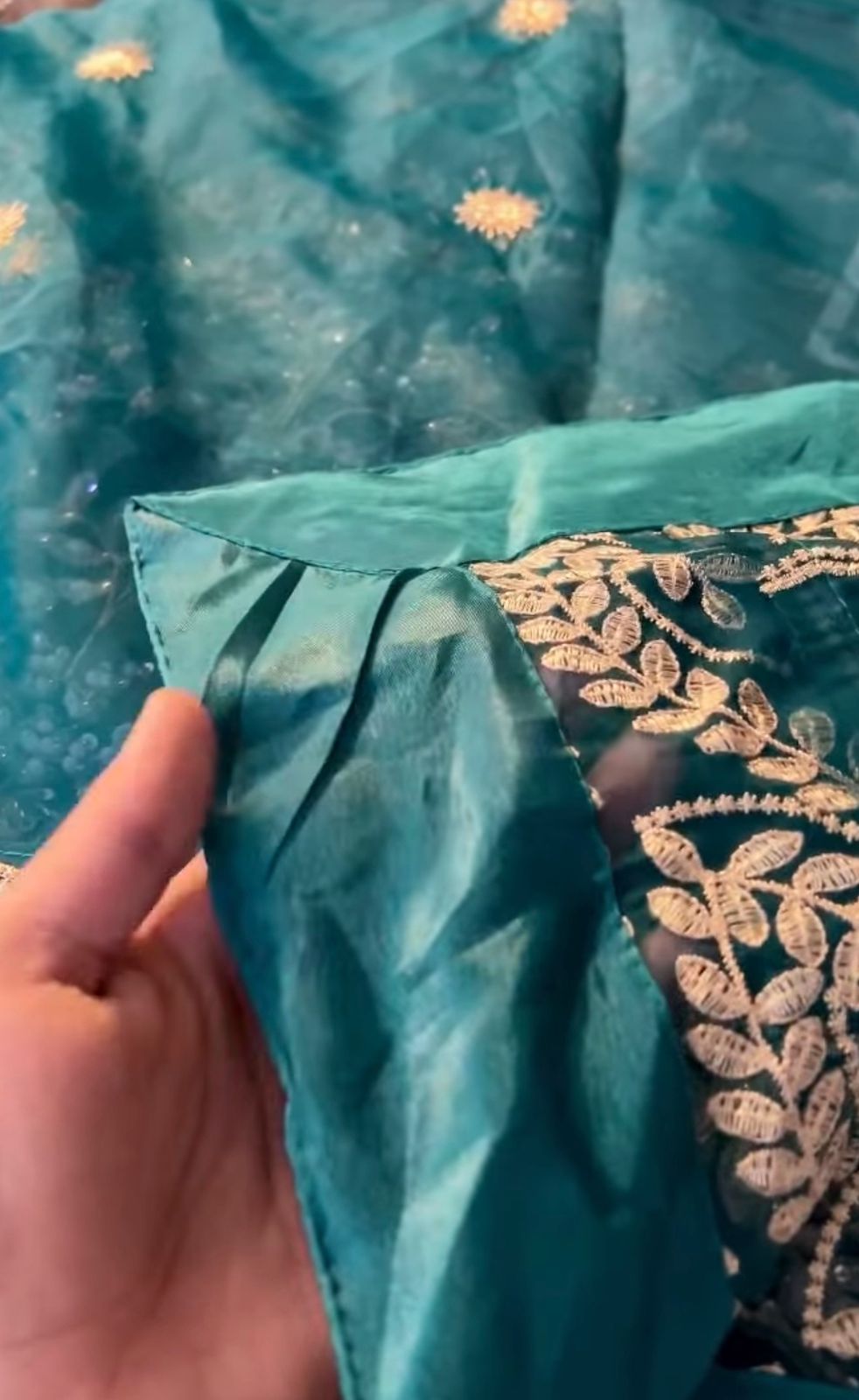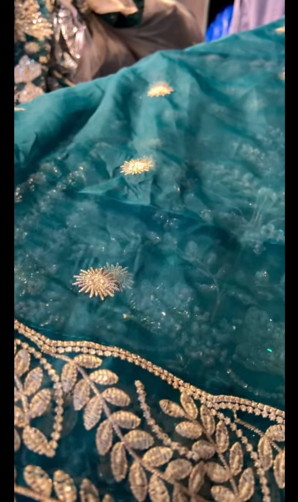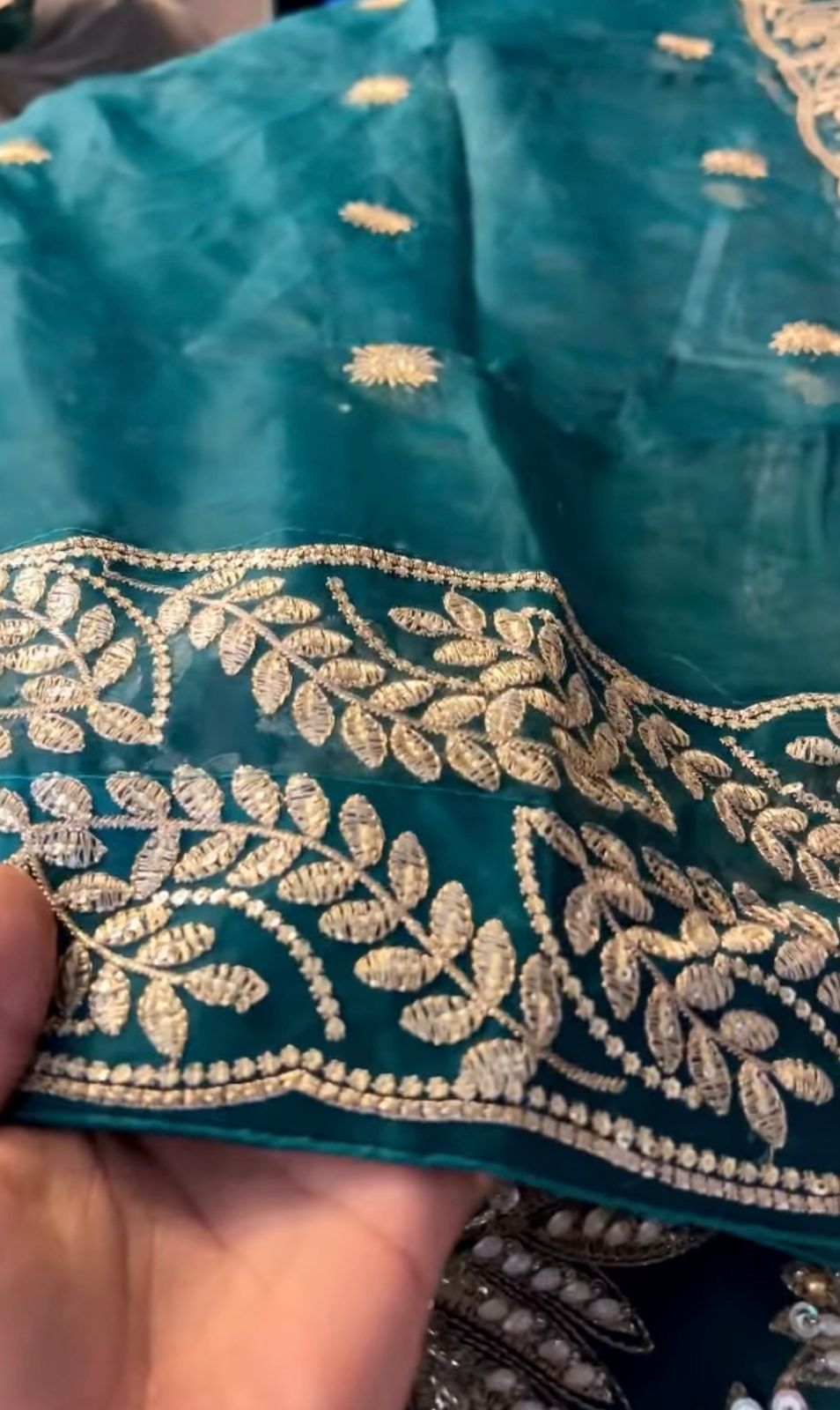 Shirt: Fully designed on organza with beautifully detailed right and left panels featuring sui dhaga embroidery and crystal embellishments.