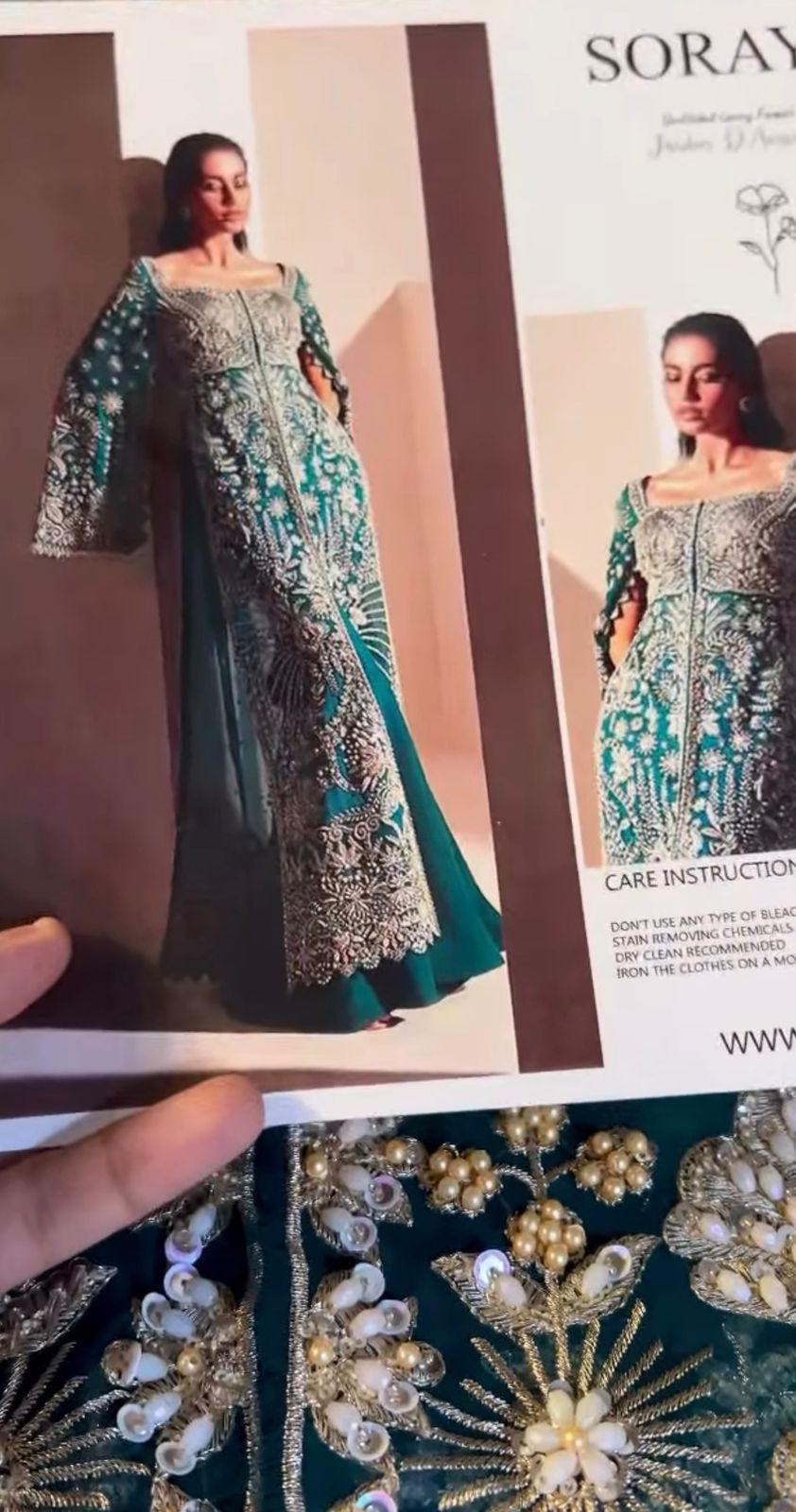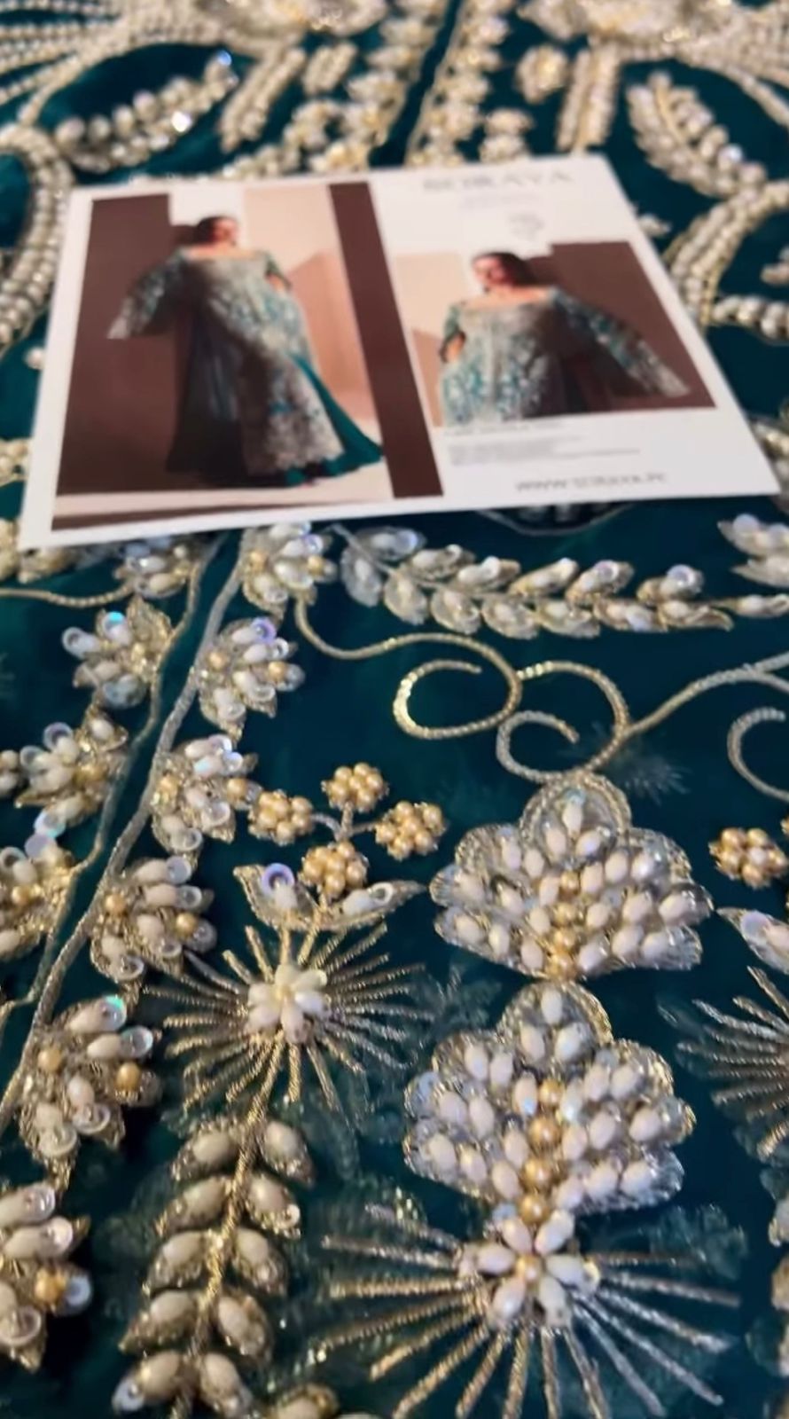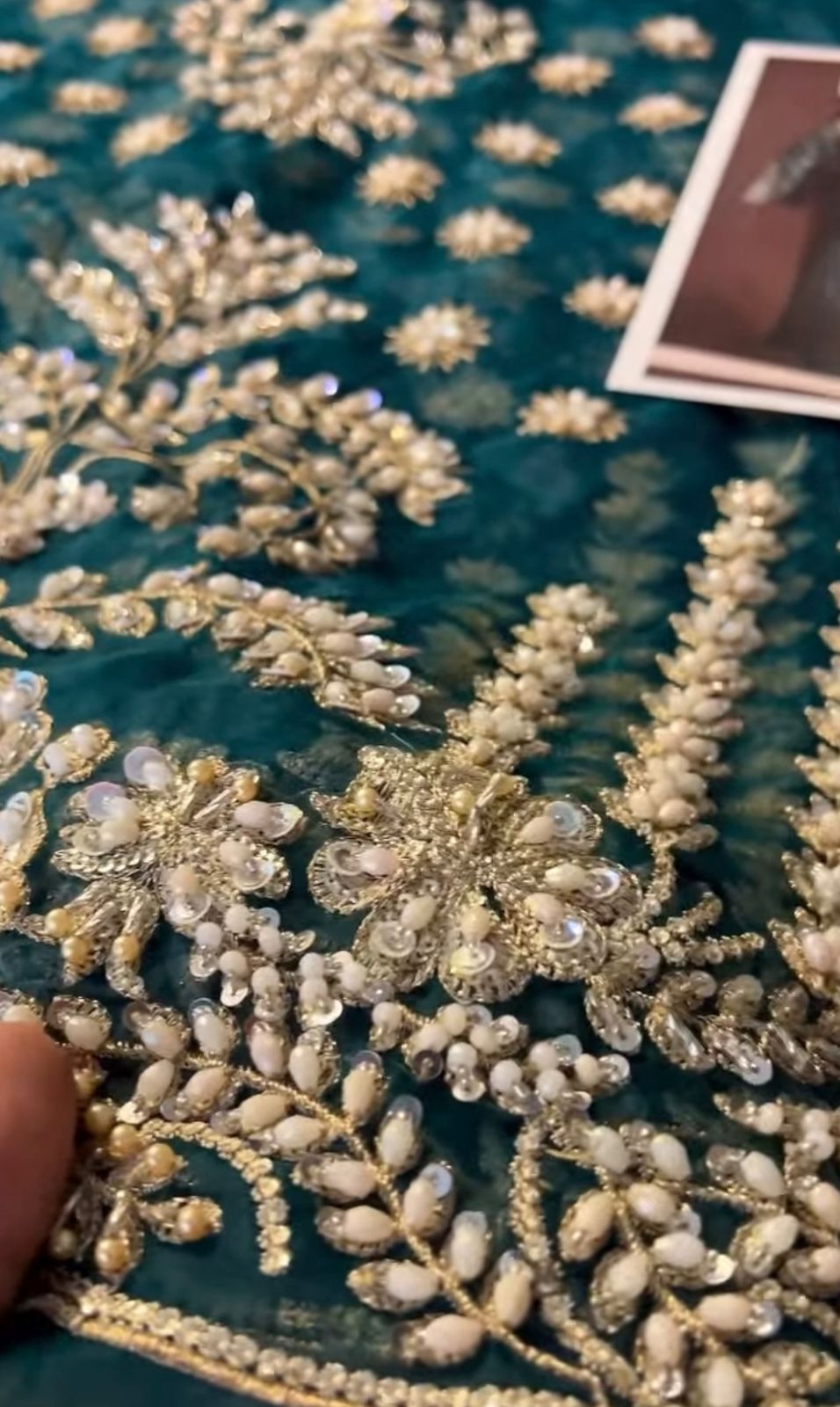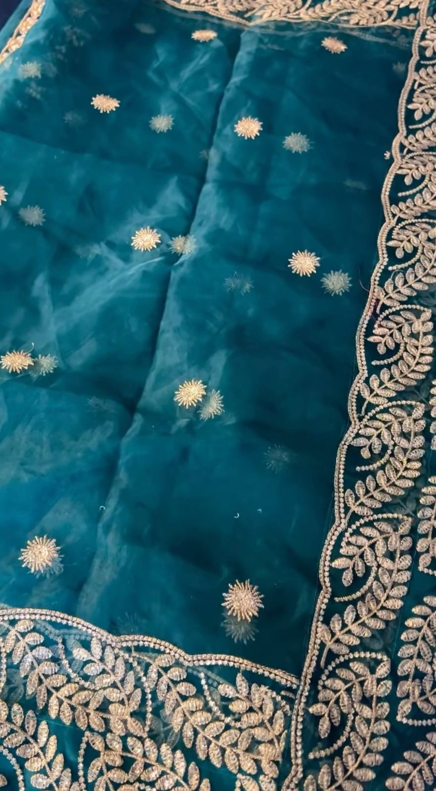 Shirt: Fully designed on organza with beautifully detailed right and left panels featuring sui dhaga embroidery and crystal embellishments.