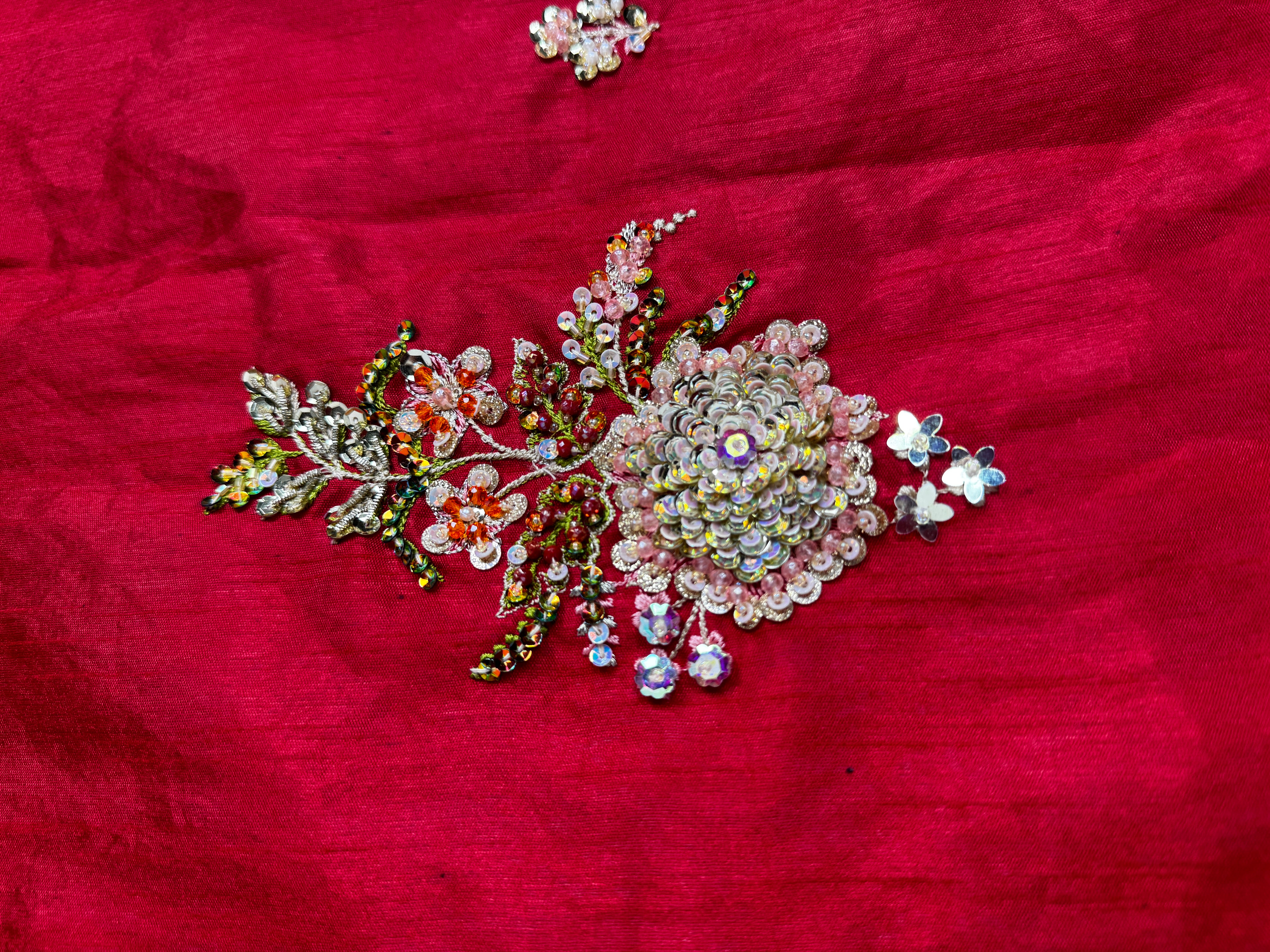 Crafted from luxurious raw silk, the outfit features a rich red hue that exudes sophistication and festive charm. The shirt is adorned with intricate embroidery on the front, back, and sleeves, showcasing fine artisanal detailing that elevates the overall look.